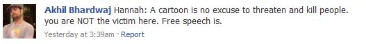 This display of intolerance and hatred is disgusting. Despite your opinion on Draw Muhammad Day, violence should not come of it. Muslims who threaten the lives or well-being are only furthering the stereotype that those who follow Islam are violent heathens. There were people who did defend Draw Muhammad Day, however: